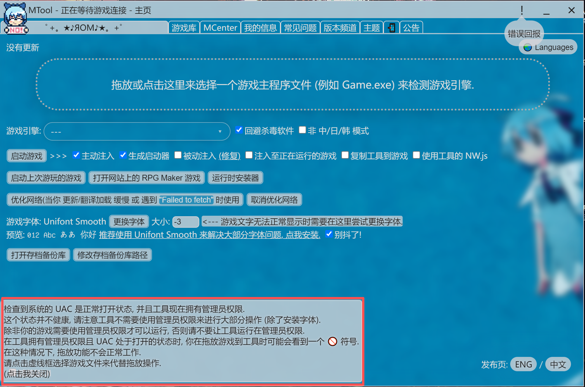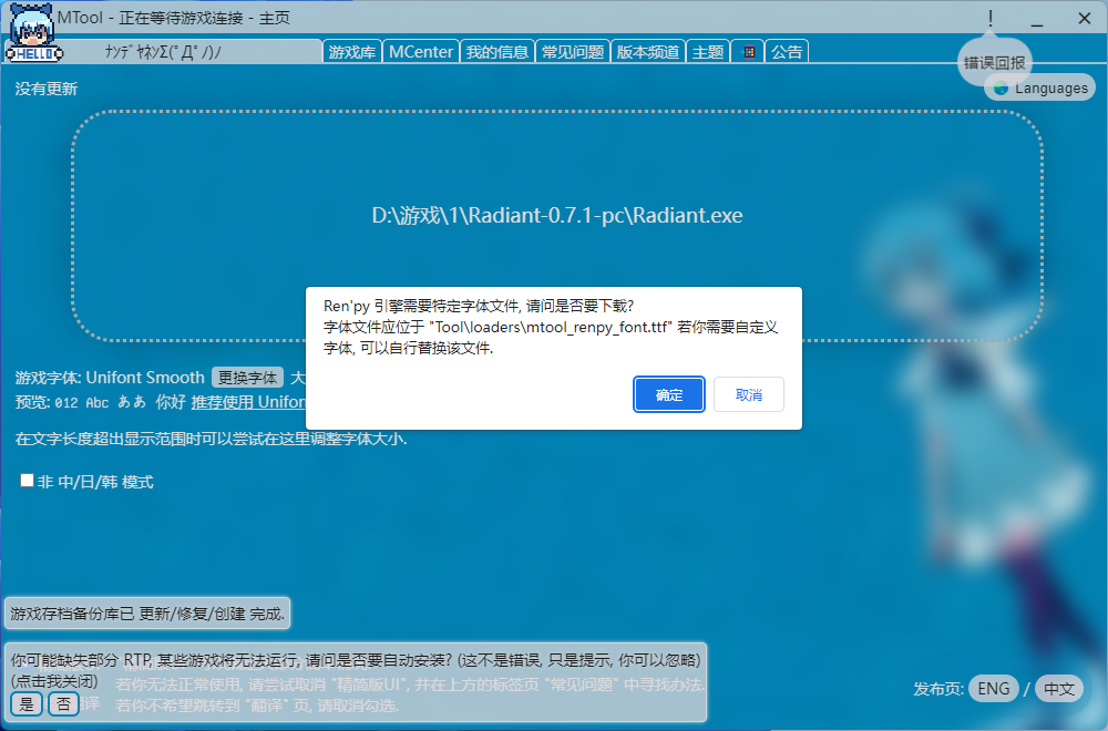 低于 6.18 或高于 8.5.2 的 SDL3 未发布版暂不支持, 可以尝试在 配置里使用内置 Ren'Py 运行时以兼容运行.